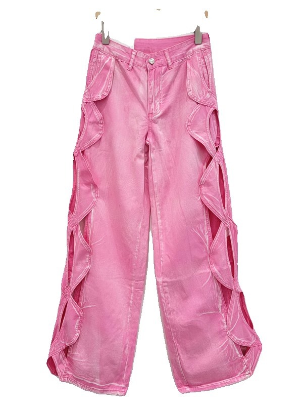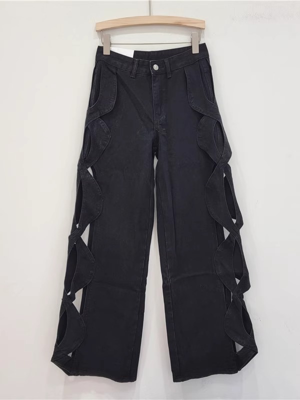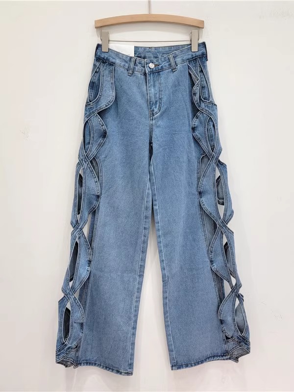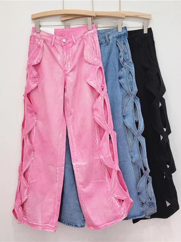 SpringSummer Side-Stranded Braid Ripped Casual Straight-Leg Wide-Leg Denim Jeans